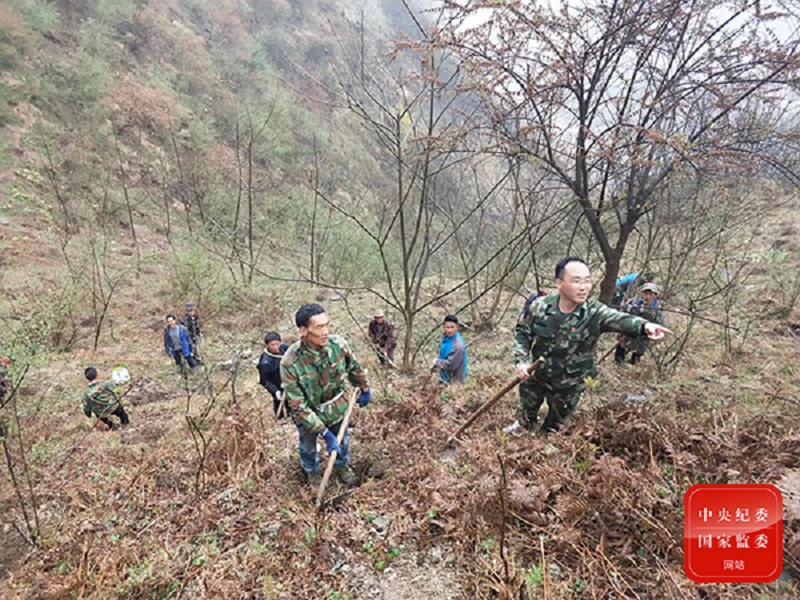 圖為宋剛(右一)帶領甲谷村干部群眾在咩咩山上種竹子。